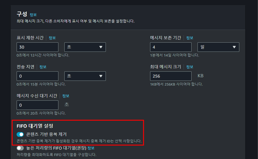 FIFO 대기열을 생성하려면 반드시 이름에 "이름.fifo" 처럼 .fifo를 붙여줘야 함. (아니면 FIFO 대기열 못만듬)