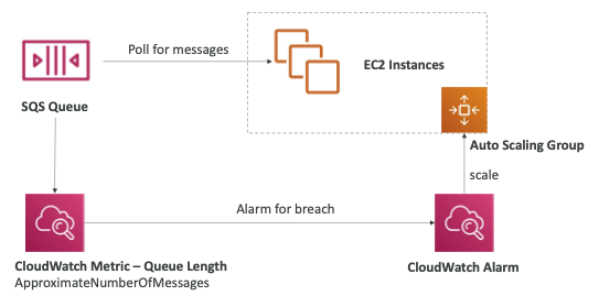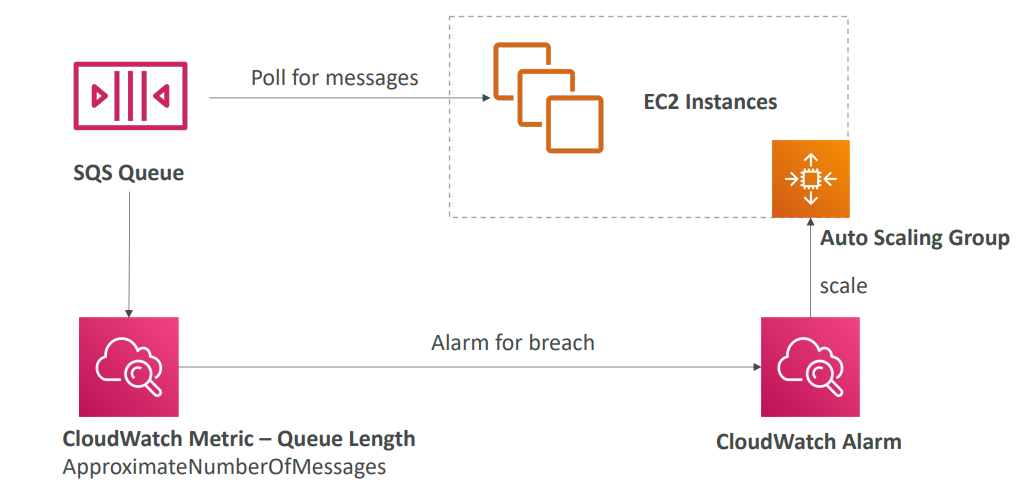 SQS 대기열과 오토 스케일링 그룹이 있을 때 ASG 내의 EC2 인스턴스에 메시지를 SQS 대기열에서 폴링합니다. 이는 오토 스케일링 그룹을 자동으로 대기열 크기에 따라 확장시키기 위함으로 CloudWatch 지표인 대기열 길이를 보고 스케일링을 결정할 수 있습니다.