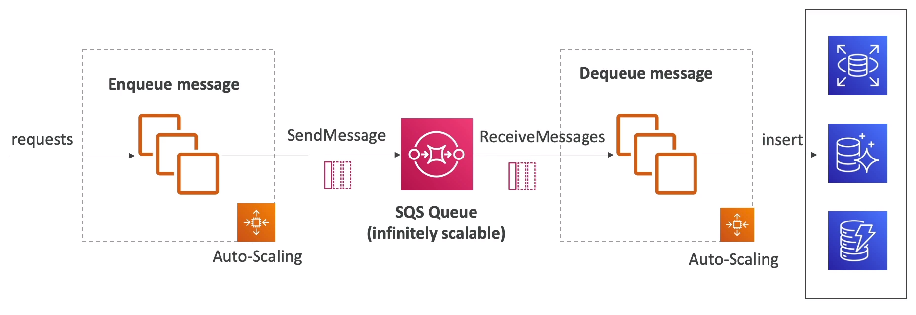 - SQS 대기열에서 더 많은 메시지가 있어서 처리량을 늘려야 하면 소비자를 추가하고 수평 확장(Auto Scaling Group)을 수행해서 처리량을 개선할 수 있습니다.