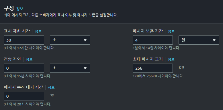 - 표시 제한 시간 / Visibility timeout (디폴트 : 30초)