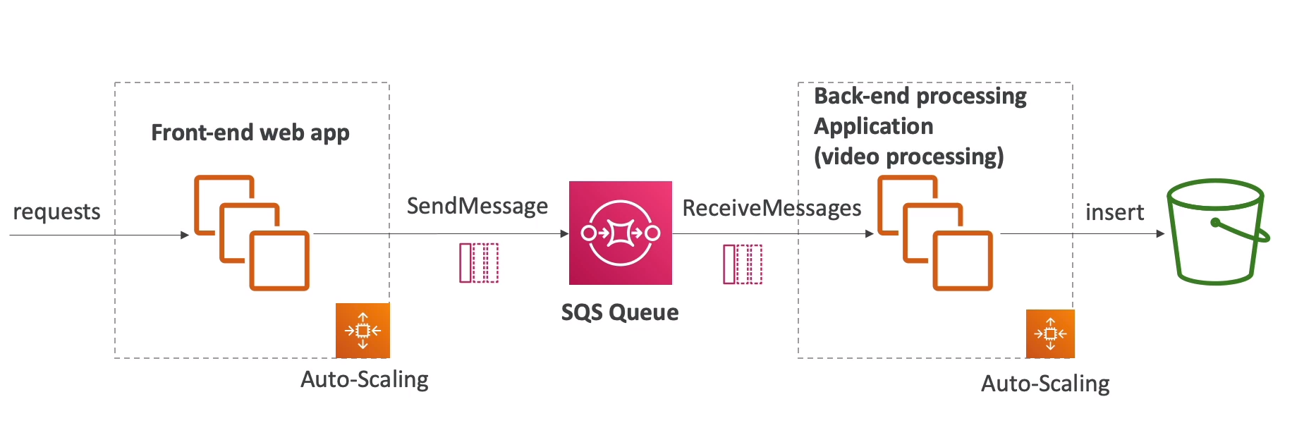 - 프론트엔드가 파일 처리 요청을 받을 때마다 SQS 대기열로 메세지를 전송하고, 처리 요청을 진행할때 그 파일은 SQS 대기열에 있게 됩니다. 그 이후 자체 오토스케일링 그룹에 속할 백엔드에서 두 번째 처리 계층을 생성할 수 있게 됩니다. 백앤드 애플리케이션이 메세지를 수신하고 비디오를 처리하고 이를 버킷에 삽입하는 식으로 일이 처리될 수 있습니다.