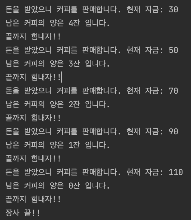 System.out.println("남은 커피의 양은 " + coffee + "잔 입니다.");