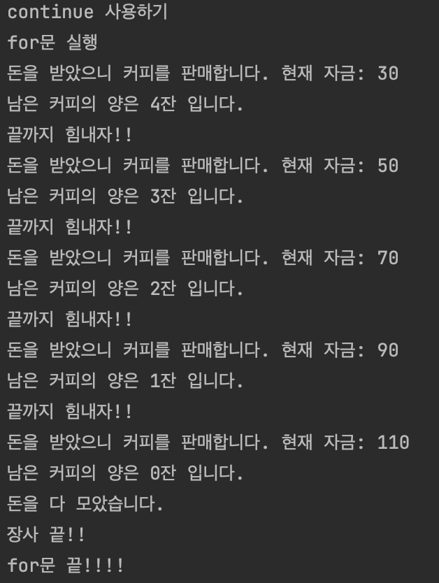 // 그리고 마지막으로 break 코드를 만나서 for 문 종료!