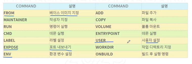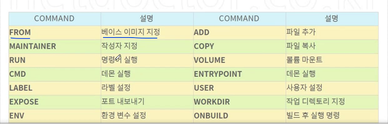 FROM은 BASE 이미지를 지정하는 작업임. FROM에는 enginx, SUSE등이 있음.