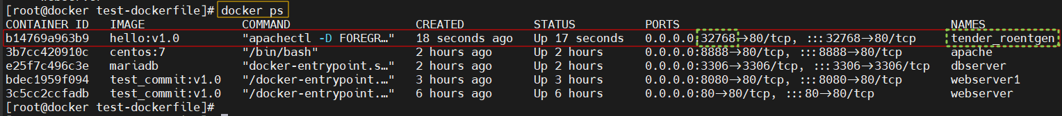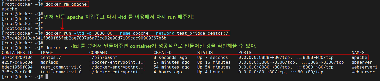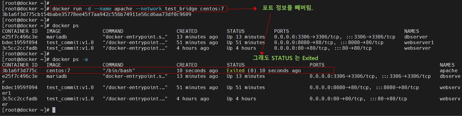 # docker rm -f apache 지우고 포트 정보를 지우고 다시 실행