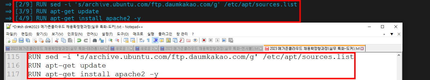 (치환명령어 archive.ubuntu.com은 미국 동부에 있는 저장소. 도커에서는 미 동부 사이트로 들어가서 설치 작업을 함. 근데 그 부분이 너무 거리가 먼곳에 접속을 하는거라 거기로 가지말고 대한민국 어딘가에 있는 kakao같은 주소로 바꾸라는 소리임.)