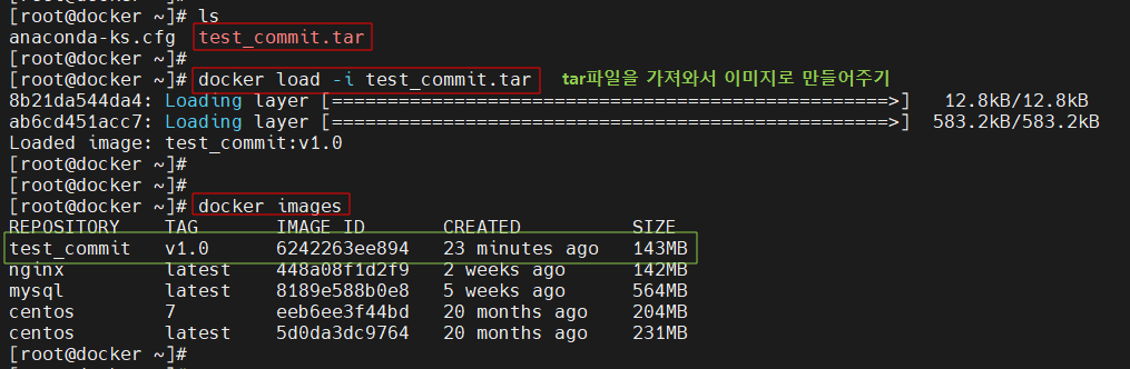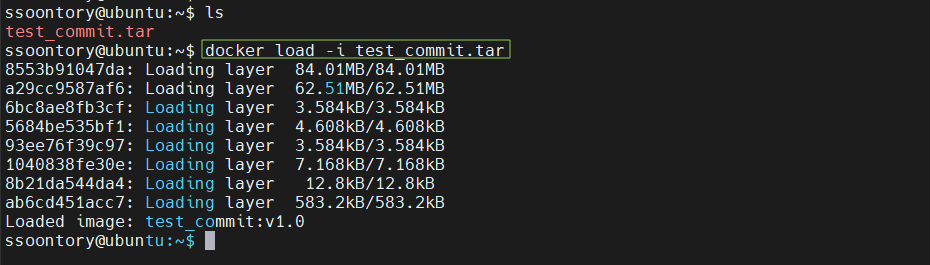 - `-i test_commit.tar`: 로드할 이미지 파일의 경로와 이름을 지정하는 옵션입니다.